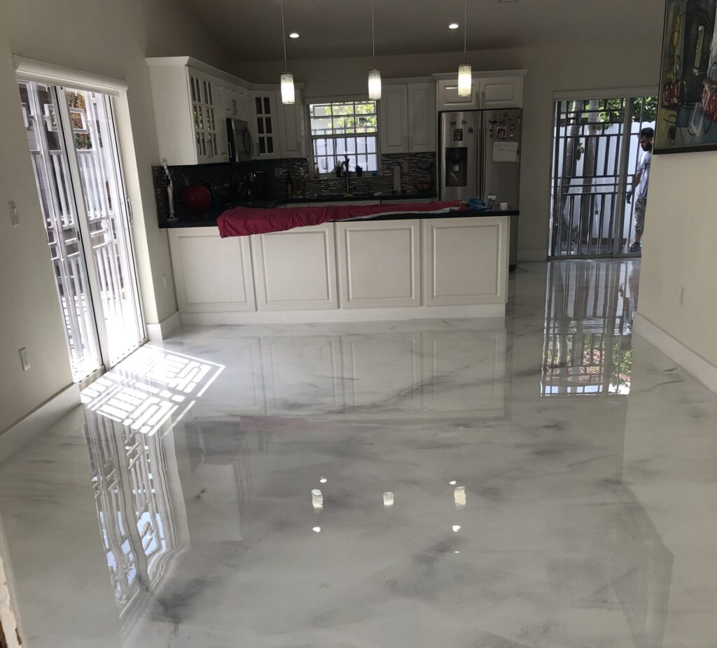 Want a high-end, artistic look? Metallic epoxy offers a reflective, marbled finish that adds depth and visual interest to any indoor space.